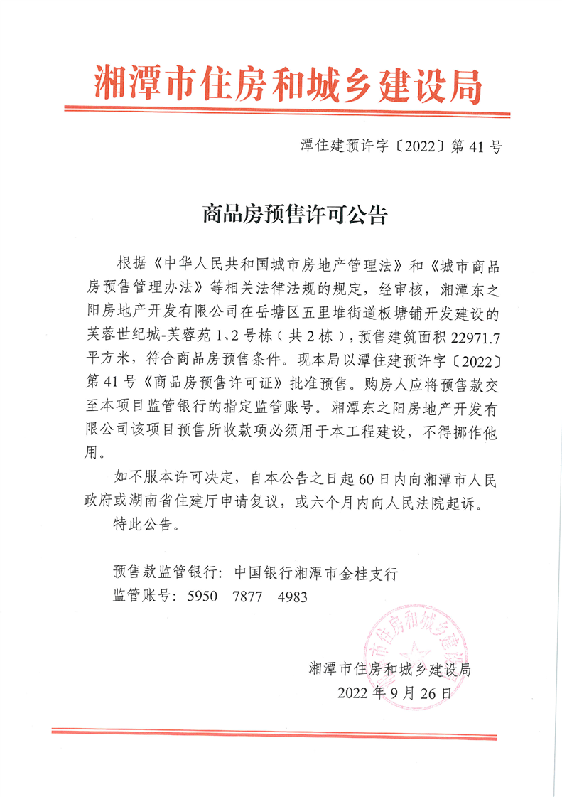 關(guān)于芙蓉世紀(jì)城-芙蓉苑1、2號棟(共2棟)預(yù)售許可公告