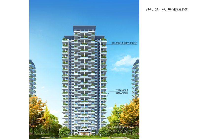 2、 一期建筑一二層及門頭材質(zhì)由石材調(diào)整為真石漆,7#、8#棟陽臺(tái)玻璃欄板改為鋅鋼欄桿,一期建筑屋頂構(gòu)架造型調(diào)整。