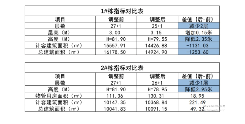 1、為提升住戶舒適度,1# 棟由原兩梯四戶調(diào)整為兩梯三戶,層高由 3 米調(diào)整為 3.15 米,層數(shù)由 27 層調(diào)整為 25 層,建筑高度由 81.8 米調(diào)整為 79.55米; 2# 棟由原兩梯三戶調(diào)整為兩梯兩戶,層高保持 3 米不變, 層數(shù)由 27 層調(diào)整為 26 層,建筑高度由 81.8 米調(diào)整為 78.8 米。