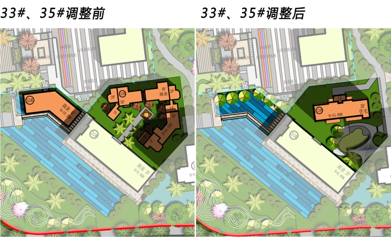 原總圖33#樓由2層(局部3層)商業(yè)調(diào)整為5層住宅,建筑面積由1243.76㎡增加至1323.32㎡,建筑高度由10.2米調(diào)整至15米,住宅戶數(shù)增加10戶。