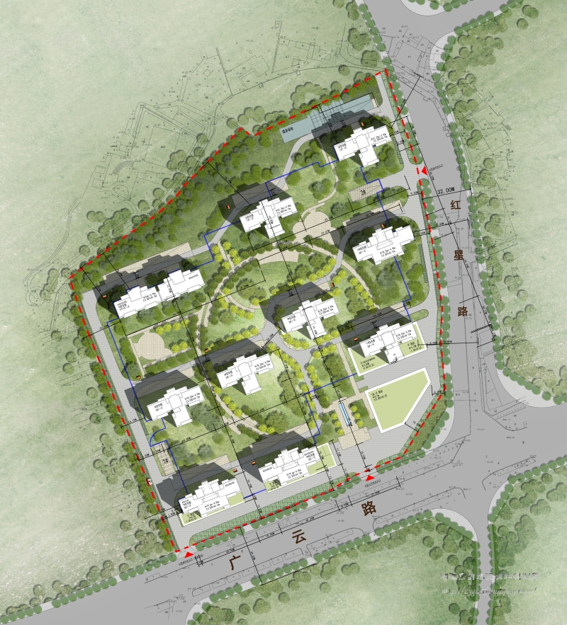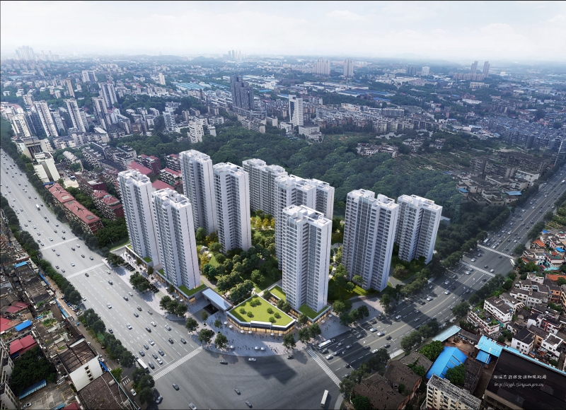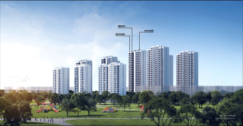 2.高層住宅以米白色涂料為主色調(diào),建筑屋頂女兒墻造型采用玻璃欄板,獨(dú)立商業(yè)采用干掛白麻光面石材搭配深棕色鋁板,裙樓商業(yè)部分采用米白色涂料搭配幕墻;建筑整體造型簡潔大氣、華麗尊貴。沿廣云路側(cè)高層住宅南立面公建化處理,臨和平公園側(cè)高層住宅北立面公建化處理。