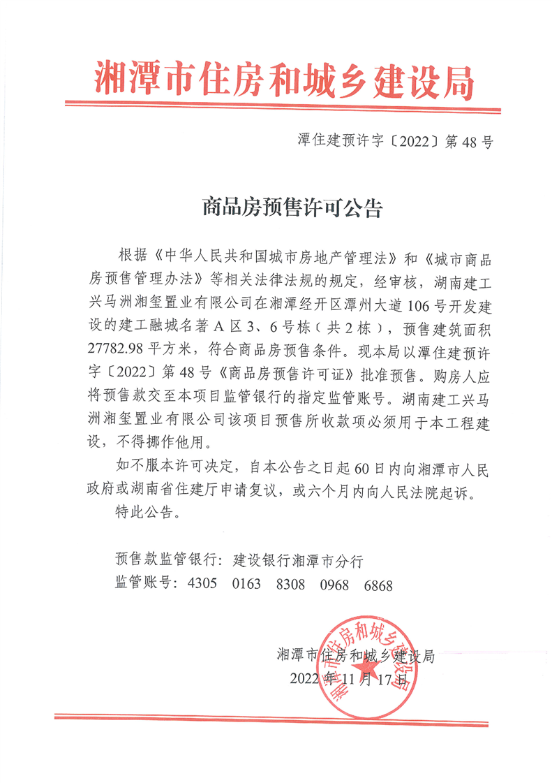 經(jīng)審核,湖南建工興馬洲湘璽置業(yè)有限公司在湘潭經(jīng)開區(qū)潭州大道 106 號開發(fā)建設(shè)的建工融城名著A區(qū)3、6號棟(共2棟),預(yù)售建筑面積27782.98 平方米,符合商品房預(yù)售條件,F(xiàn)本局以潭住建預(yù)許字〔2022〕第48 號《商品房預(yù)售許可證》批準(zhǔn)預(yù)售。