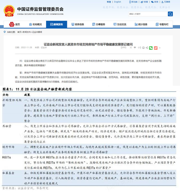 11月28日證監(jiān)會新聞發(fā)言人表示,為支持房地產市場平穩(wěn)健康發(fā)展,證監(jiān)會決定在股權融資方面調整優(yōu)化5項措施,并自即日起施行。此次政策主要目的是支持修復優(yōu)質房企的資產負債表,推動行業(yè)優(yōu)化整合。