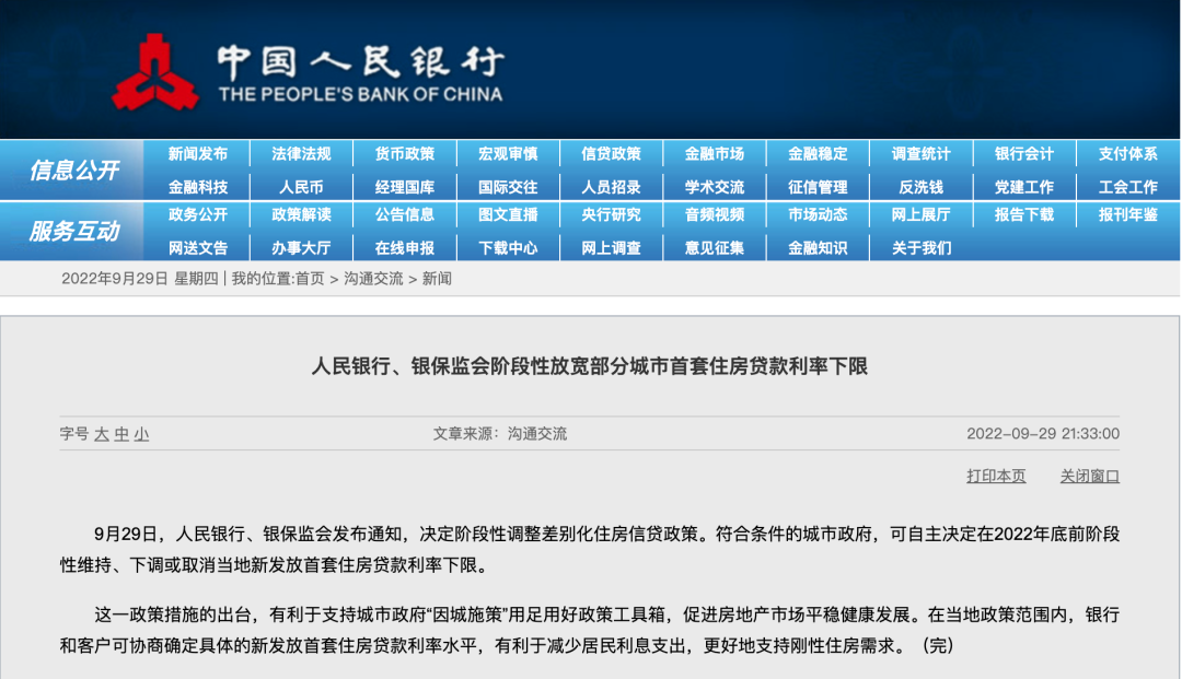 2022年9月29日,人民銀行、銀保監(jiān)會發(fā)布通知,決定階段性放寬部分城市首套住房貸款利率下限。