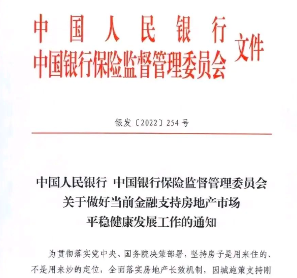 2022 年 11 月 11 日央行與銀保監(jiān)會印發(fā)的內部文件——《關于做好當前金融支持房地產市場平穩(wěn)健康發(fā)展工作的通知》(銀發(fā)〔2022〕254 號)。通知涉及保持房地產融資平穩(wěn)有序、積極做好“保交樓”金融服務、積極配合做好受困房地產企業(yè)風險處置、依法保障住房金融消費者合法權益、階段性調整部分金融管理政策、加大住房租賃金融支持力度等6方面,共16條具體措施。