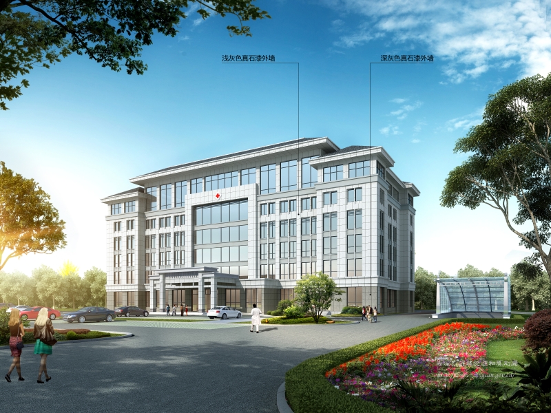 2.建筑立面采用簡約現(xiàn)代風格,強調(diào)建筑豎向,立面以淺灰色涂料為主色調(diào),體現(xiàn)醫(yī)療行業(yè)高尚無暇的特點。