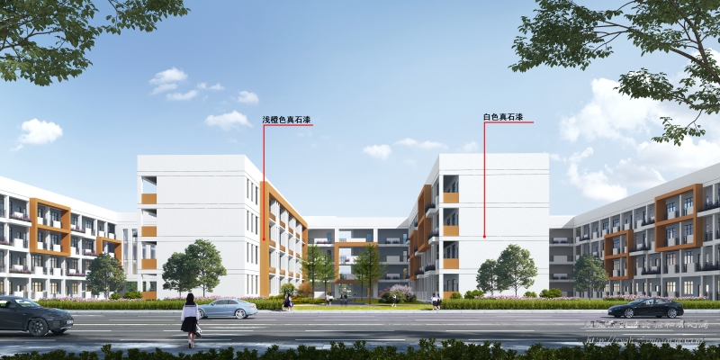 2.校園基色調(diào)采用冷色色調(diào)的中明度、低艷度的白色,局部突出造型、百葉為淺橙輔助色點(diǎn)綴,通過(guò)精巧的白色和橙色“框”的設(shè)計(jì)彰影顯教學(xué)樓的文化氛圍。