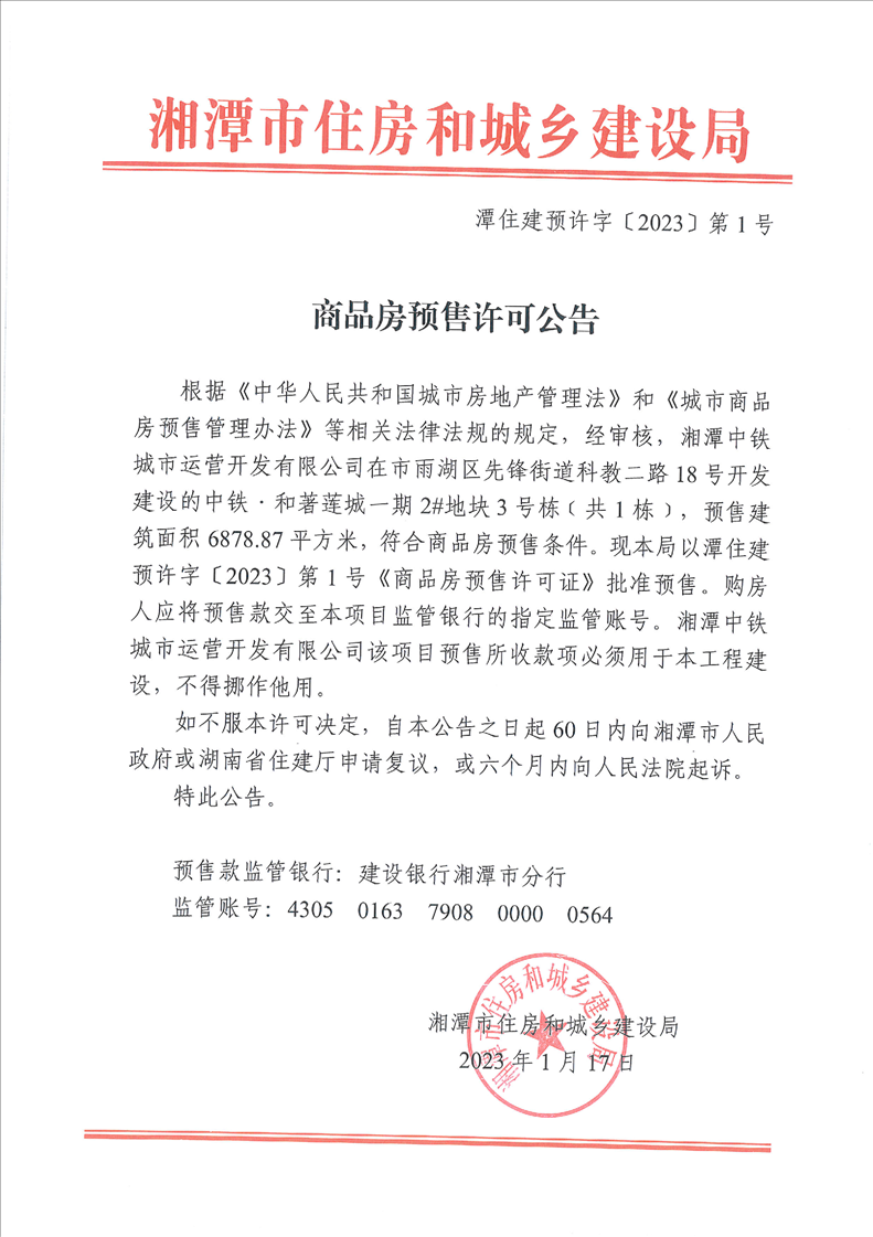 經(jīng)審核,湘潭中鐵城市運(yùn)營(yíng)開(kāi)發(fā)有限公司在市雨湖區(qū)先鋒街道科教二路18號(hào)開(kāi)發(fā)建設(shè)的中鐵·和著蓮城一期2#地塊3號(hào)棟(共1棟),預(yù)售建筑面積 6878.87 平方米,符合商品房預(yù)售條件,F(xiàn)本局以潭住建預(yù)許字〔2023〕第1號(hào)《商品房預(yù)售許可證》批準(zhǔn)預(yù)售。