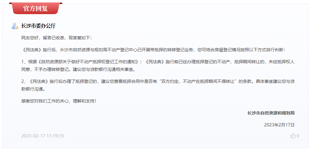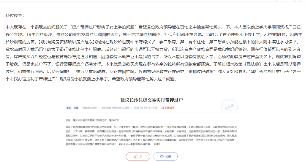 湘潭房產(chǎn)網(wǎng)2月21日訊 近日,有網(wǎng)友在紅網(wǎng)問政咨詢《反映長沙房產(chǎn)帶押過戶影響子女上學(xué)的問題》