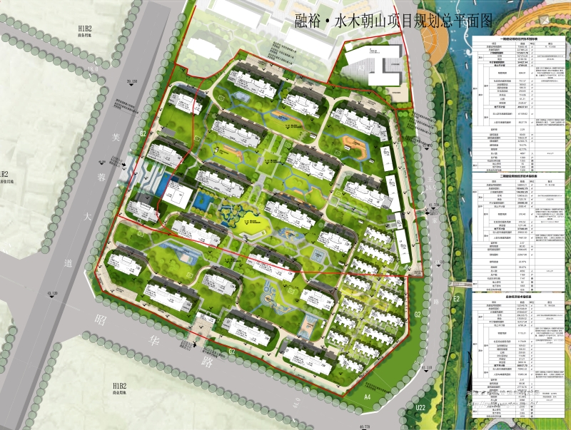 項(xiàng)目總用地面積為132549.76㎡,規(guī)劃總建筑面積413568.01㎡,計(jì)容建筑面積319840.07㎡,綜合容積率2.41,建筑密度20.91%,綠地率41.44%,機(jī)動(dòng)車停車位2502個(gè)。項(xiàng)目總體規(guī)劃布局為198.82畝,分兩期開發(fā),一期開發(fā)用地124.84畝(109.45畝+15.39畝),二期開發(fā)用地73.98畝,整體布局20棟一類高層住宅,建筑高度分別為79.8米、72.75米、73.9米,建筑層數(shù)27層、23層、25層,沿城鐵一號(hào)路為臨街商業(yè),建筑高度分別為15.45米和10.2米。高層住宅以米白色真石漆為主色調(diào),建筑屋頂女兒墻采用深灰金屬欄桿,輔以橫向線條點(diǎn)綴;項(xiàng)目通過(guò)提取昭山文化和現(xiàn)代住宅設(shè)計(jì)元素的設(shè)計(jì)手法,體現(xiàn)了項(xiàng)目現(xiàn)代、簡(jiǎn)約、典雅的建筑形象,同時(shí)與周邊環(huán)境相融合,彰顯昭山魅力。