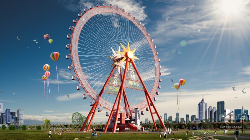 (4)摩天輪設(shè)備情況:摩天輪以朝陽紅色為基調(diào),熱情活力風(fēng)格;主要技術(shù)參數(shù)如下:總高度:128米;轎廂軸直徑:115米;轉(zhuǎn)盤直徑:109.2米;轎廂數(shù):42個;轎廂定額:6人;一圈時間25分鐘。