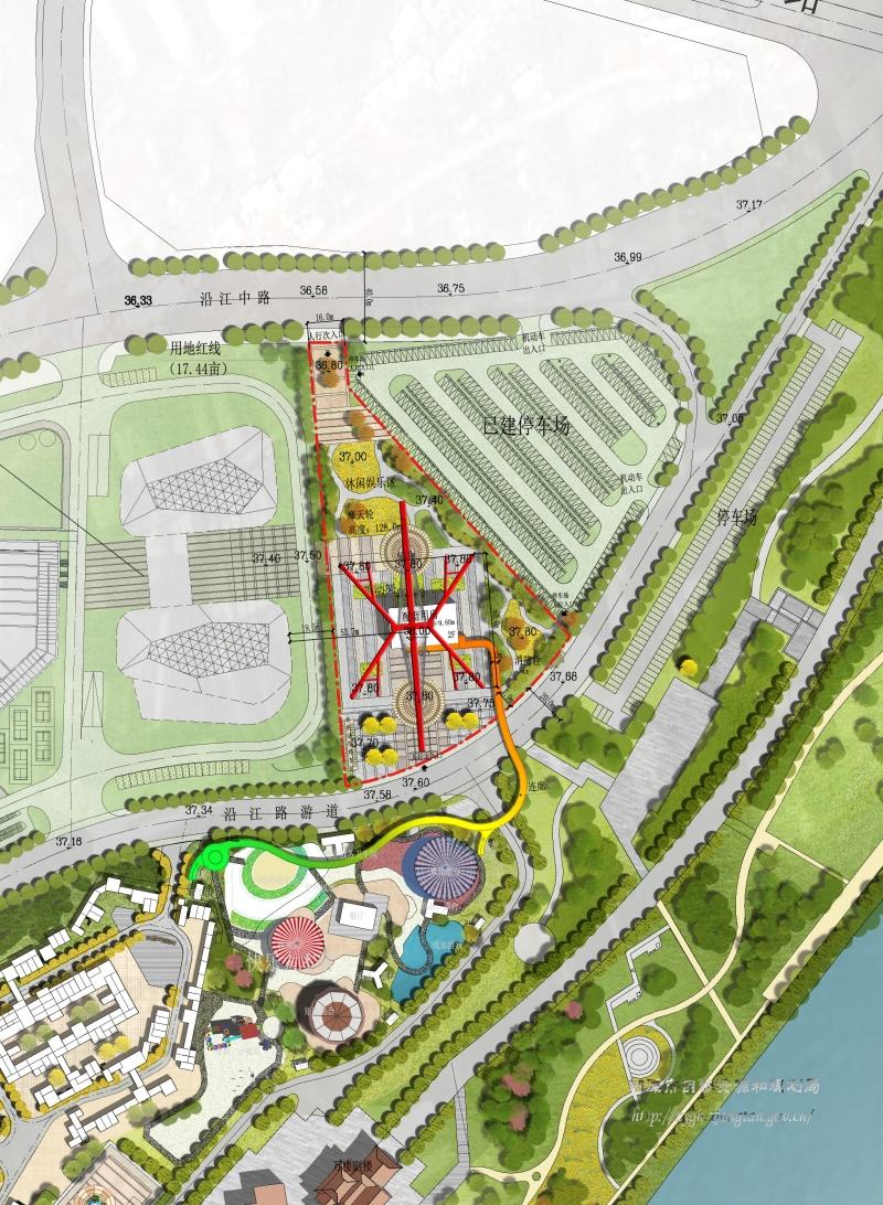 (2)規(guī)劃布局情況:規(guī)劃總體劃分為三大功能區(qū),休閑廣場區(qū)、核心景觀區(qū)、休閑娛樂區(qū)