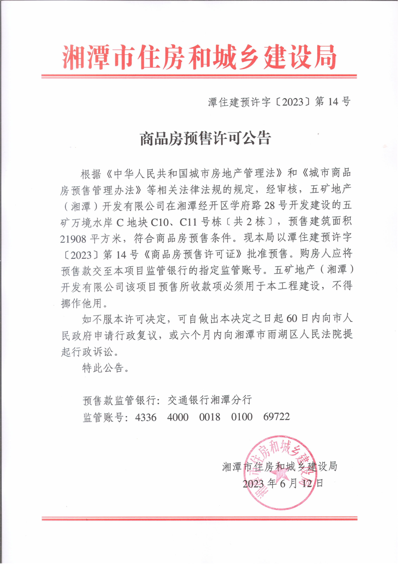 經(jīng)審核,五礦地產(chǎn)(湘潭)開發(fā)有限公司在湘潭經(jīng)開區(qū)學府路28號開發(fā)建設(shè)的五礦萬境水岸C地塊C10、C11號棟〔共2棟〕,預(yù)售建筑面積21908平方米,符合商品房預(yù)售條件。現(xiàn)本局以潭住建預(yù)許字[2023]第14號《商品房預(yù)售許可證》批準預(yù)售。