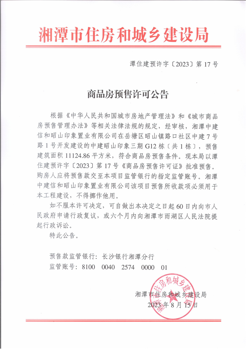 經(jīng)審核,湘潭中建信和昭山印象置業(yè)有限公司在岳塘區(qū)昭山鎮(zhèn)路口社區(qū)中建7號(hào)路1號(hào)開(kāi)發(fā)建設(shè)的中建昭山印象三期G12棟〔共1棟〕,預(yù)售建筑面積11124.86平方米,符合商品房預(yù)售條件,F(xiàn)本局以潭住建預(yù)許字〔2023〕第17號(hào)《商品房預(yù)售許可證》批準(zhǔn)預(yù)售。