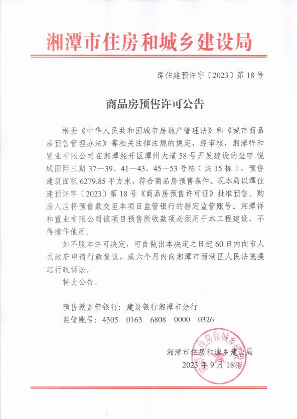 經(jīng)審核,湘潭祥和置業(yè)有限公司在湘潭經(jīng)開區(qū)潭州大道58號開發(fā)建設的璽宇.悅城國際三期37-39、41-43、45一53號棟(共15棟),預售建筑面積 6279.85平方米,符合商品房預售條件,F(xiàn)本局以潭住建預許字[2023]第18號《商品房預售許可證》批準預售。
