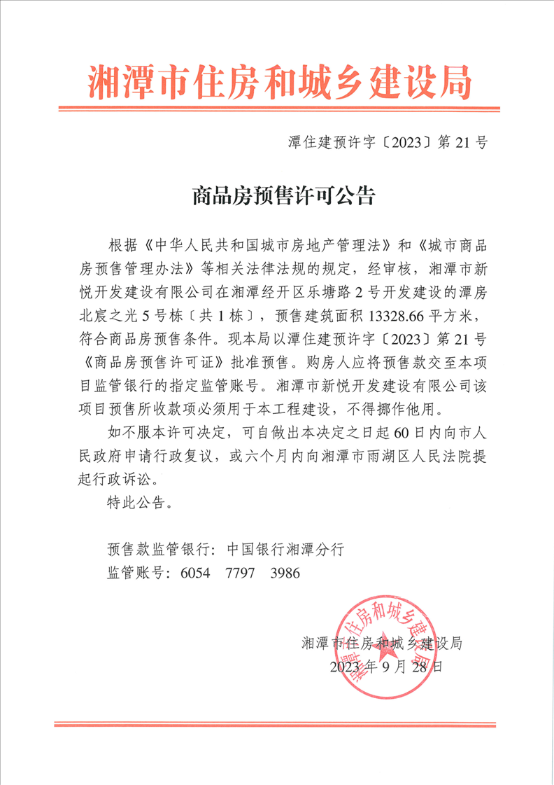 經(jīng)審核,湘潭市新悅開發(fā)建設(shè)有限公司在湘潭經(jīng)開區(qū)樂塘路2號(hào)開發(fā)建設(shè)的潭房北宸之光5號(hào)棟[共1棟了,預(yù)售建筑面積13328.66平方米,符合商品房預(yù)售條件。現(xiàn)本局以潭住建預(yù)許字[2023]第21號(hào)《商品房預(yù)售許可證》批準(zhǔn)預(yù)售。