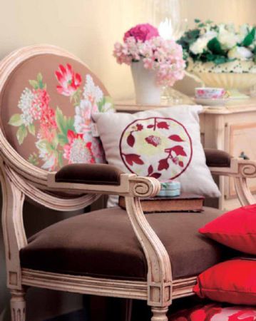 椅子和抱枕都可以開出一朵朵繁花,盡顯主人的浪漫情懷。桌子上敦實的花器和座椅彼此呼應(yīng),清新的白色花束淡化了古典主義的濃重,讓人感覺放松愜意。