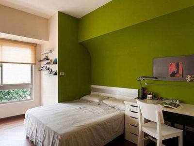 為了克服床頭上方梁柱壓迫感,設(shè)計(jì)師以圓弧包覆處理,再加以重綠色引領(lǐng)視覺(jué),墻面也以層板及不銹鋼增加收納空間,營(yíng)造出視覺(jué)流動(dòng)。