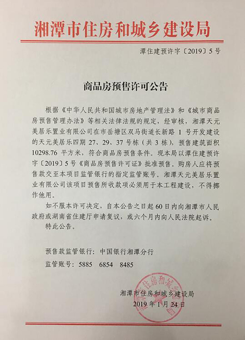 經(jīng)審核,湘潭天元美居樂置業(yè)有限公司在市岳塘區(qū)雙馬街道長(zhǎng)新路1號(hào)開發(fā)建設(shè)的天元美居樂四期27、29、37號(hào)棟(共3棟),預(yù)售建筑面積10298.76平方米,符合商品房預(yù)售條件,F(xiàn)湘潭市住建局以潭住建預(yù)許字【2019】4號(hào)《商品房預(yù)售許可證》批準(zhǔn)預(yù)售。 |
