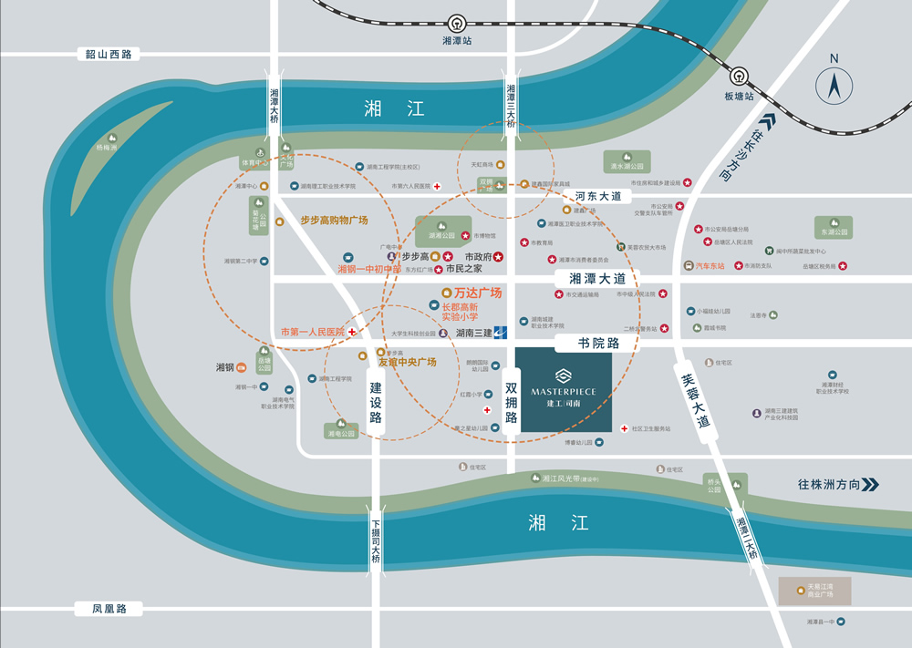 建工·司南擇址湘潭南延發(fā)展高地“岳塘核芯區(qū)”,雄踞城市主干道雙擁路之上,串聯(lián)起湘潭政務(wù)中芯、商業(yè)中芯及文化中芯,周邊匯聚交通、商業(yè)、醫(yī)療、生態(tài)、教育等一城優(yōu)越資源,成就家門口的一站式生活體驗(yàn)。